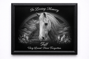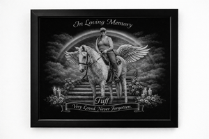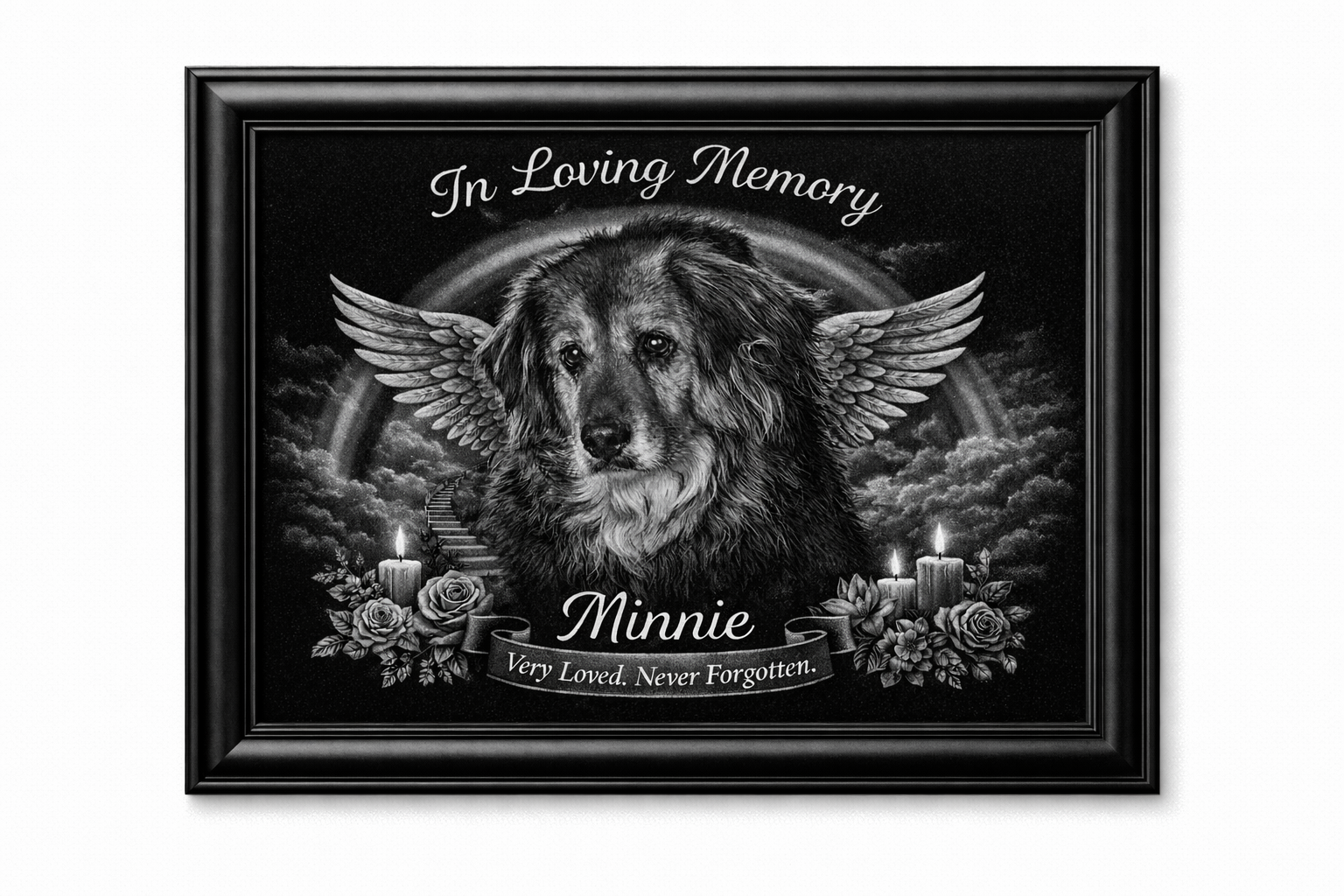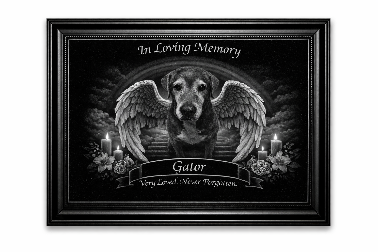 The Rainbow Bridge represents the peaceful place where beloved pets are believed to wait until they reunite with their families again. Our etchings reflect that emotional connection through elegant design, balanced tonal contrast, and faithful photo detail — creating a meaningful tribute you can see, display, and cherish every day.